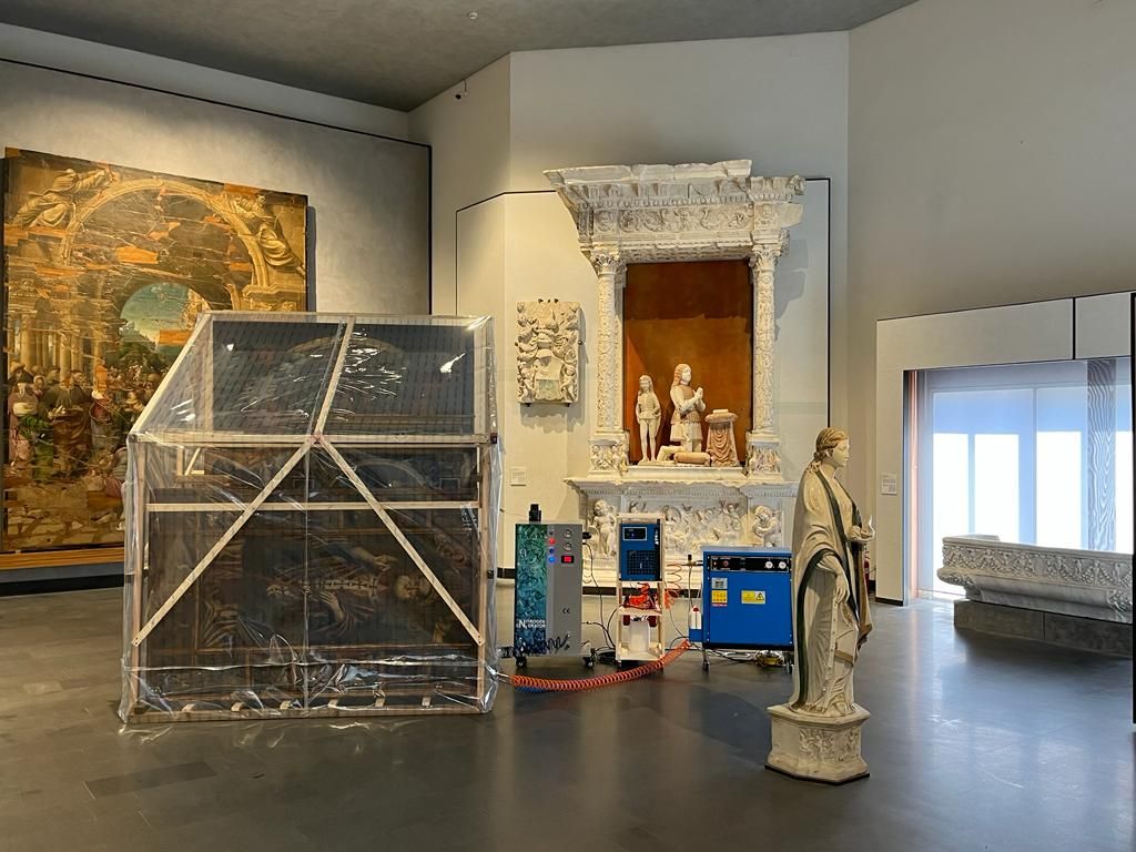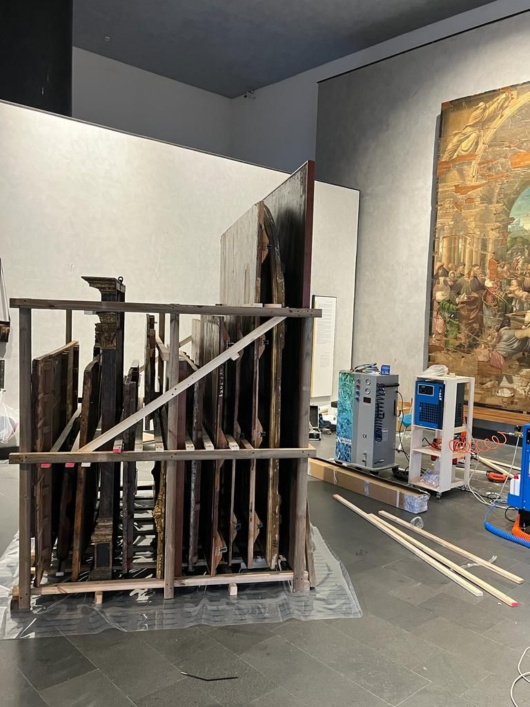 Nel laboratorio, inoltre, alcuni locali sono destinati alle analisi strumentali non invasive, quali riflettografia Infrarosso, fluorescenza Ultravioletta e microscopia ottica, spazi attrezzati in sicurezza con aspiratori di vario genere per la pulitura e la verniciatura dei dipinti, autoclavi per la disinfestazione anossica e per l’impregnazione sottovuoto, locali per il deposito delle opere, e anche magazzini per la logistica.